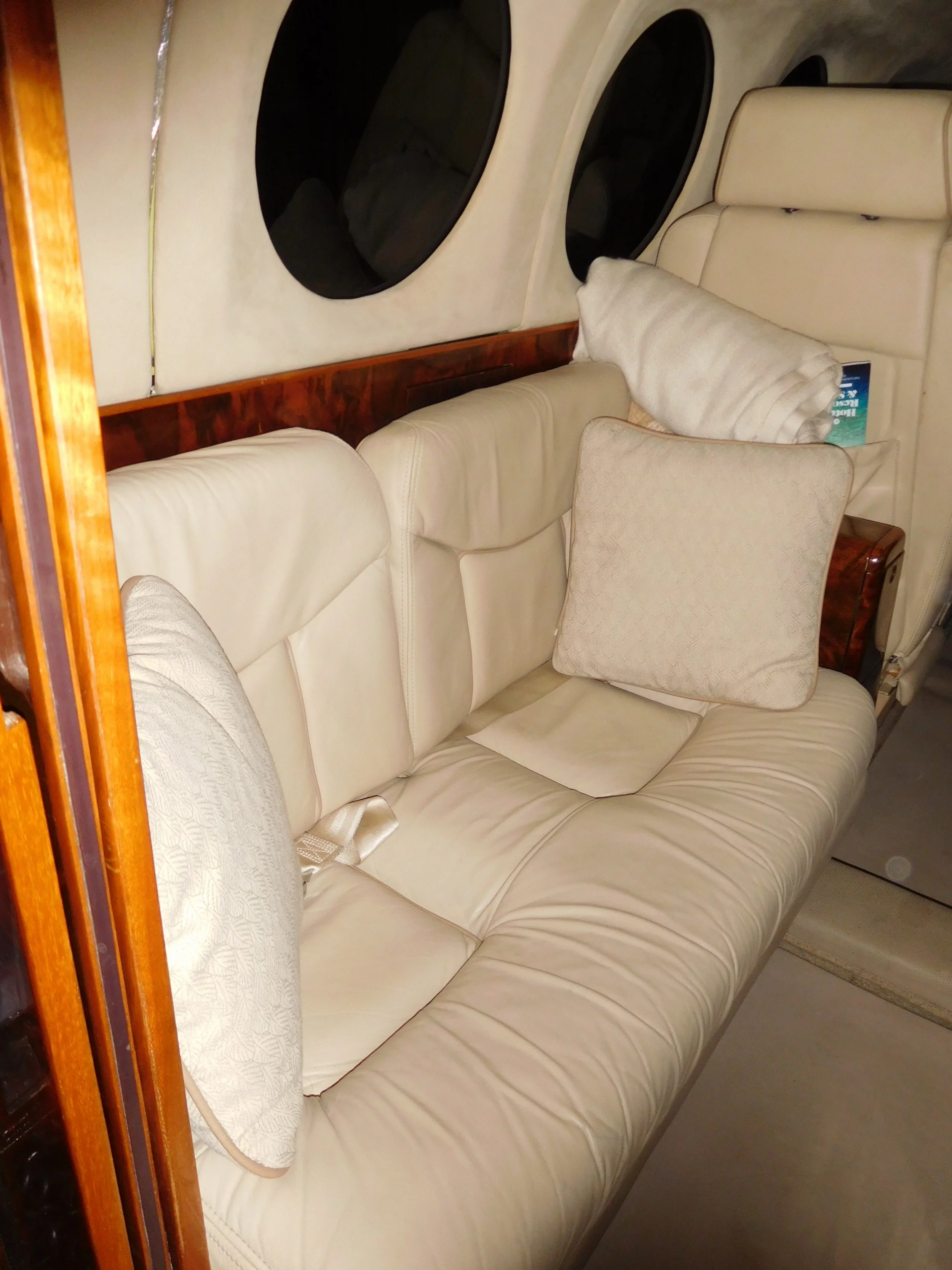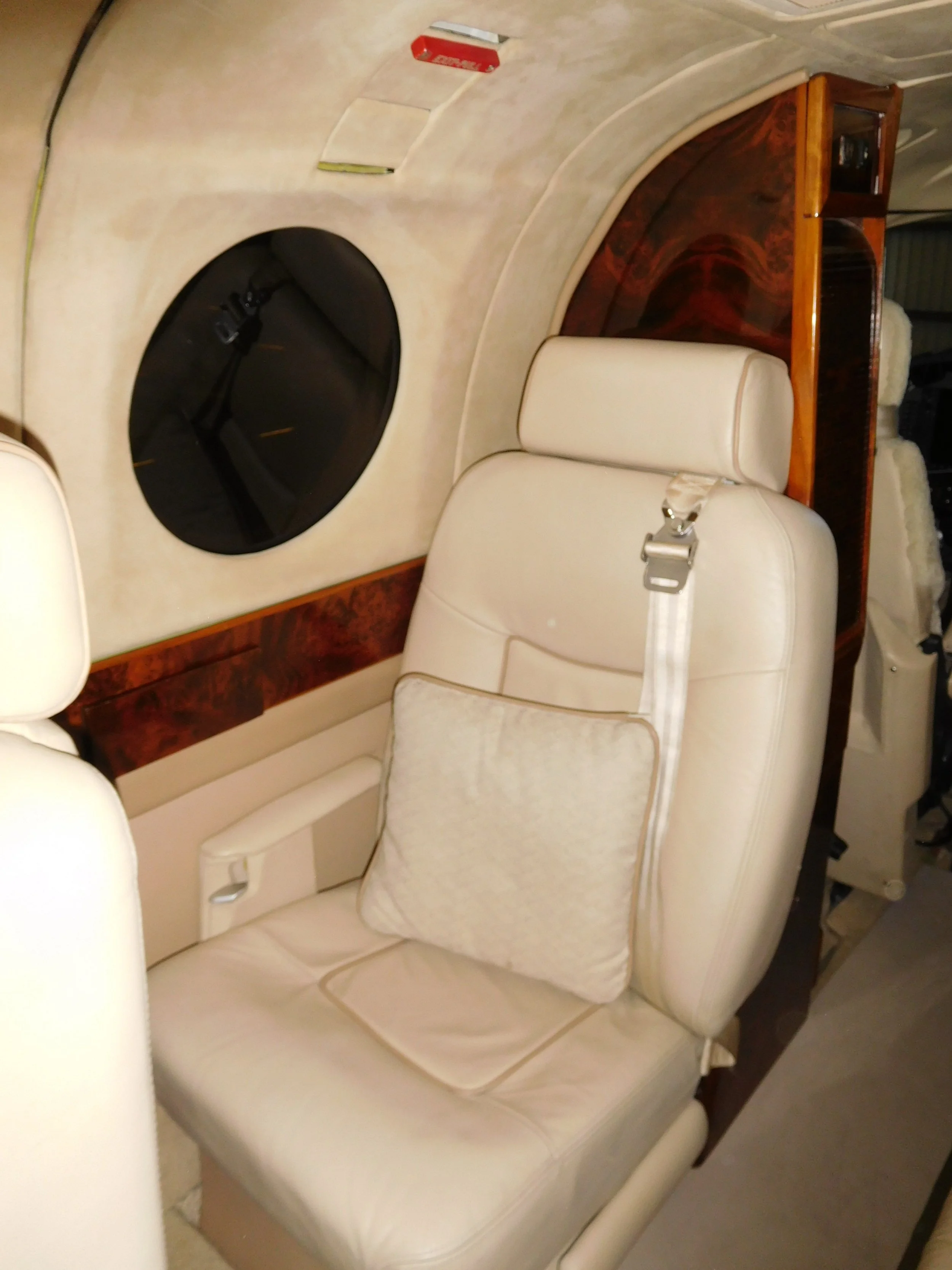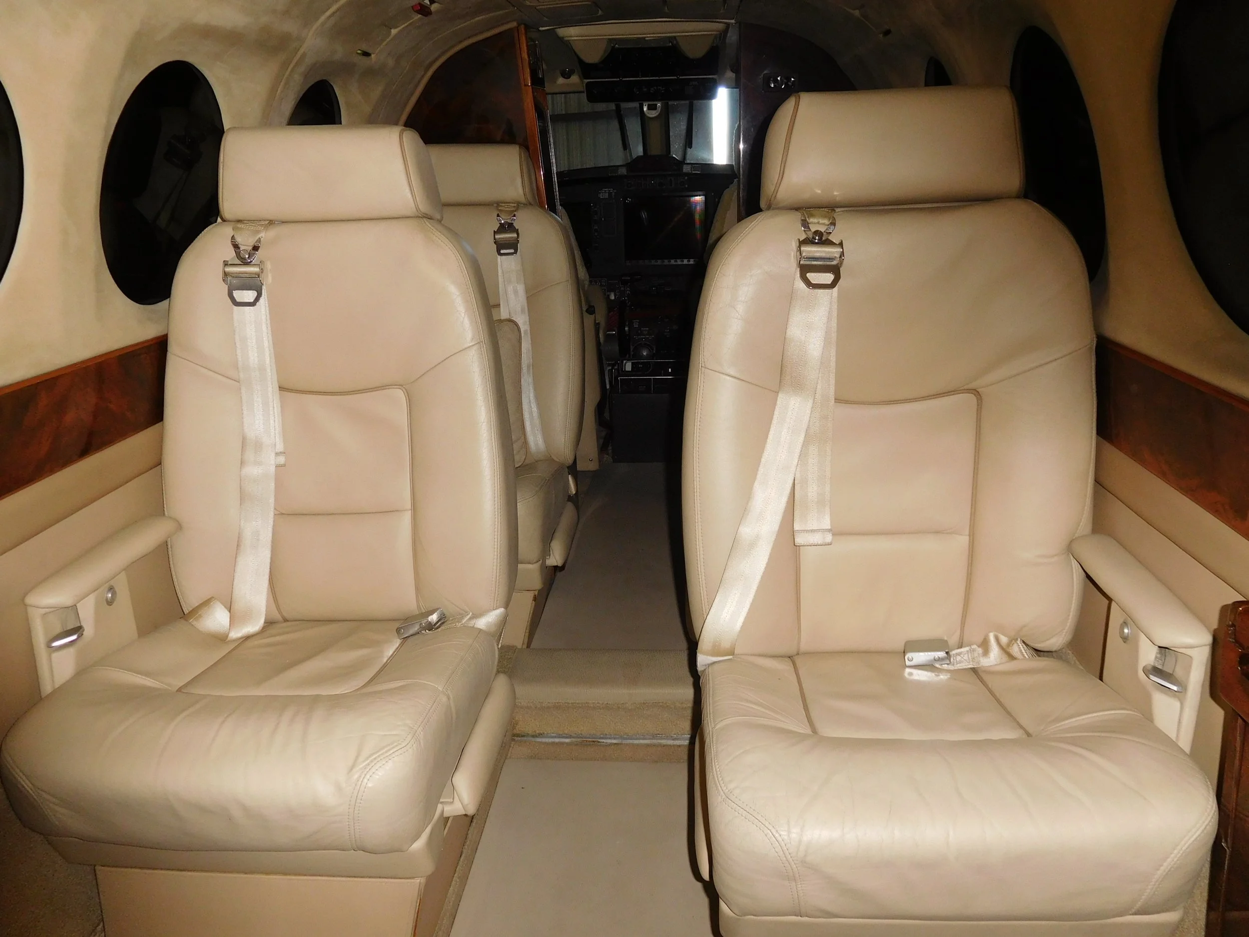 9 Passenger interior in Beige leather with accented side panels, headliner and carpets with matching vinyl runner. Medium Burlwood veneer.